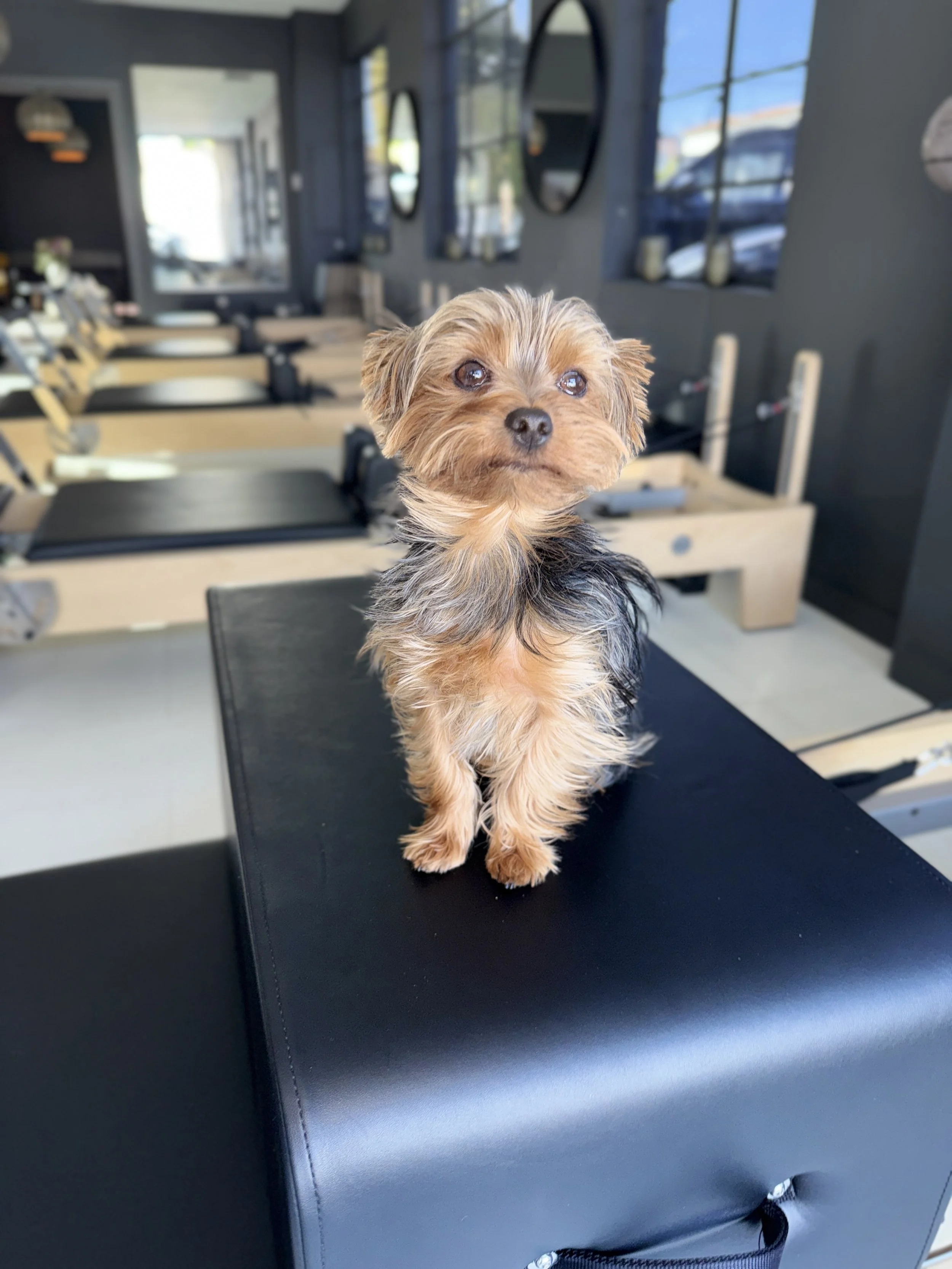 I began my career early in life. I started in small crate watching classes and worked my way up the ladder with diligence, hard work, charm, and lots of snuggles. I often ride on clients’ backs to make sure their table tops are perfect form. I live for feet in straps because that always means goodbye hugs from my favorite VLP clients and snacks.